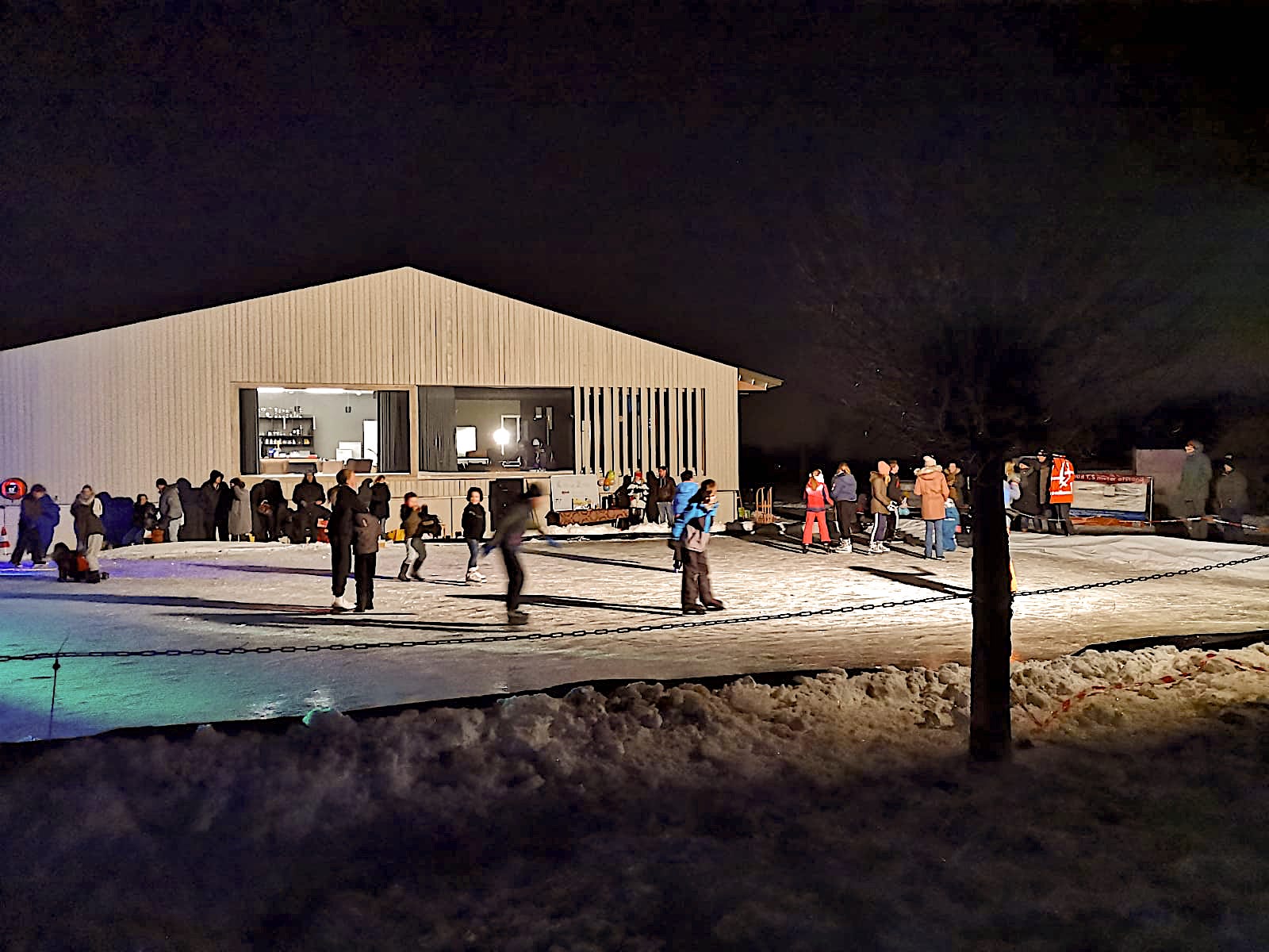 (Er komt wel een plek waar de kinderen hun schaatsen onder kunnen binden; je hoeft niet klunend door het dorp).